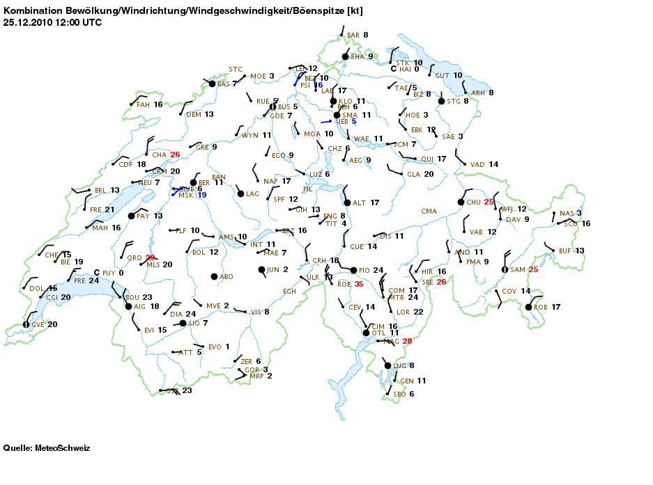 | Windgeschwindigkeit, Windrichtung, Böenspitzen in kt und Bewölkung, 25. Dezember 2010, 13h MEZ |